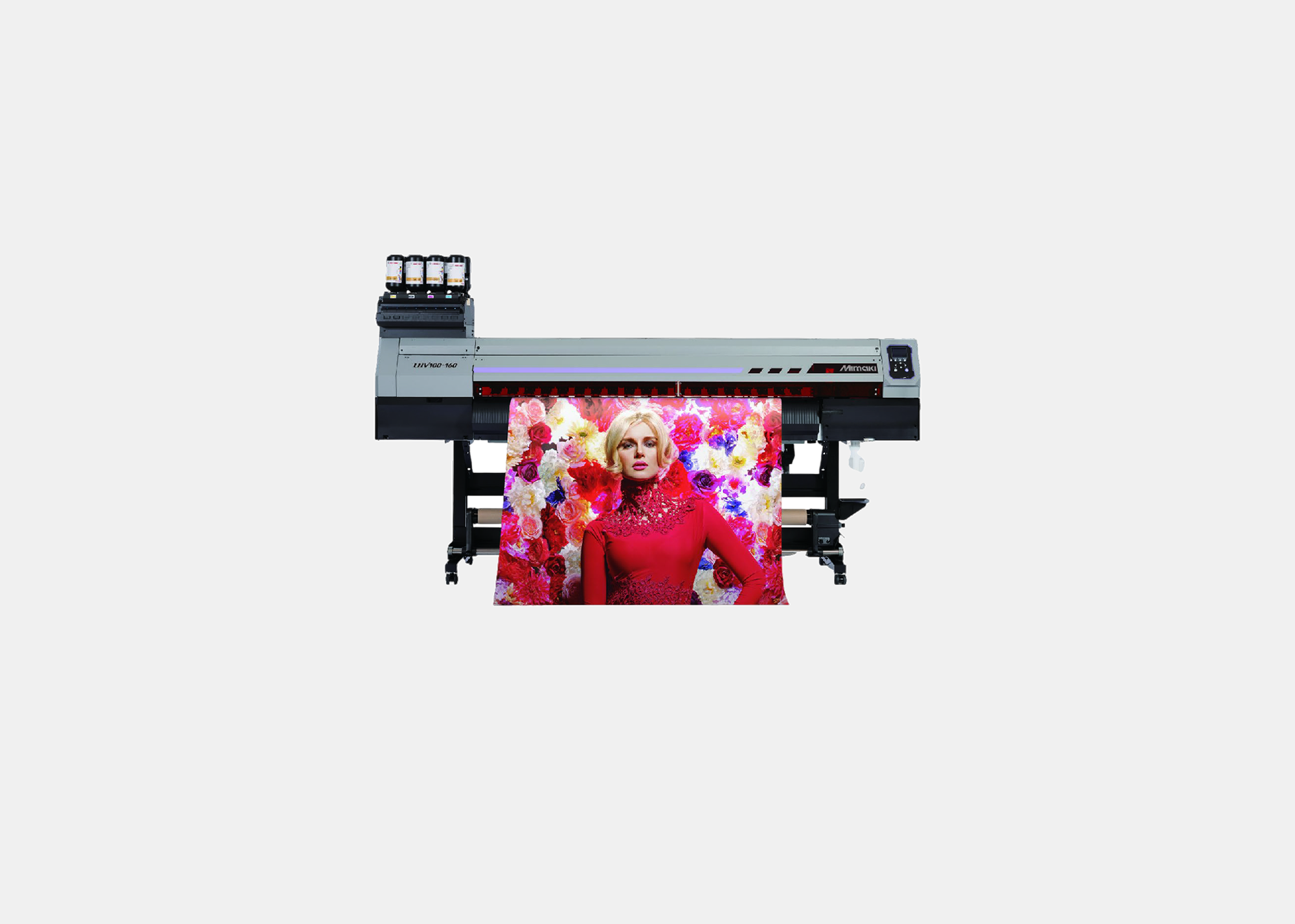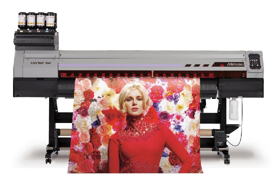 「UJV100-160」搭载了新开发的2组喷头,是具有高画质和高生产性、追求稳定运行的UV固化喷墨打印机。考虑到围绕地球的环境问题和法规,采用了不含VOC(挥发性有机化学物)的UV固化墨水。打印后经UV光照射即刻固化,因此无需水性墨水和溶剂墨水所必要的干燥时间。此外,UV固化墨水可用于无涂层的纸类和PET薄膜、布类等广泛的市售材料、有助于降低材料成本。